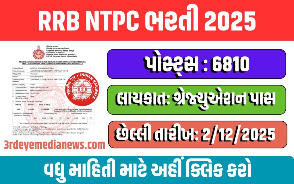 2025ની Railway Recruitment Board (RRB) NTPC ગ્રેજ્યુએટ લેવલ ભરતી વિશે સમગ્ર માહિતી – 5810 જગ્યાઓની જાહેરાત, ફોર્મ ભરવાની તારીખ, કોઈપણ ઉમેદવાર માટે મહત્વપૂર્ણ વિગતો.