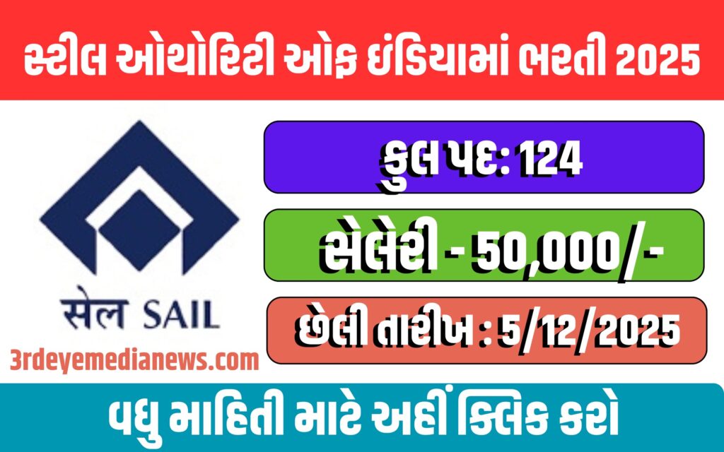 સ્ટીલ ઓથોરિટી ઓફ ઈન્ડિયા લિમિટેડ (SAIL) એ 2025 માટે 124 મેનેજમેન્ટ ટ્રેની (ટેક્નિકલ) પોસ્ટોની ભરતી જાહેર કરી છે. આ તક એન્જિનિયરિંગ ગ્રેજ્યુએટ્સ માટે સુવર્ણ અવસર છે, જેમાં એક વર્ષના ટ્રેનિંગ પછી E1 ગ્રેડમાં કાયમી નિમણૂક થશે. જો તમે યોગ્ય છો, તો તાત્કાલિક અરજી કરો અને આ આકર્ષક કારકિર્દીની શરૂઆત કરો.